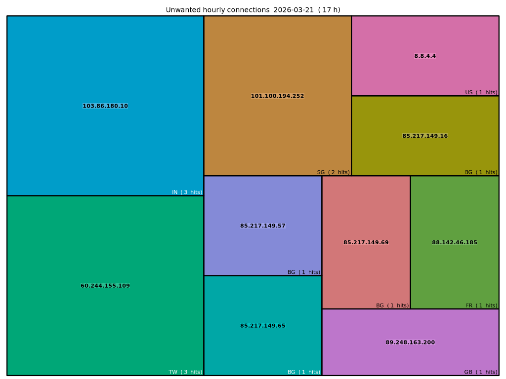 | "ZL" | Treemap: Top IP addresses trying unwanted connections (hourly). | Unwanted connections (hourly). |